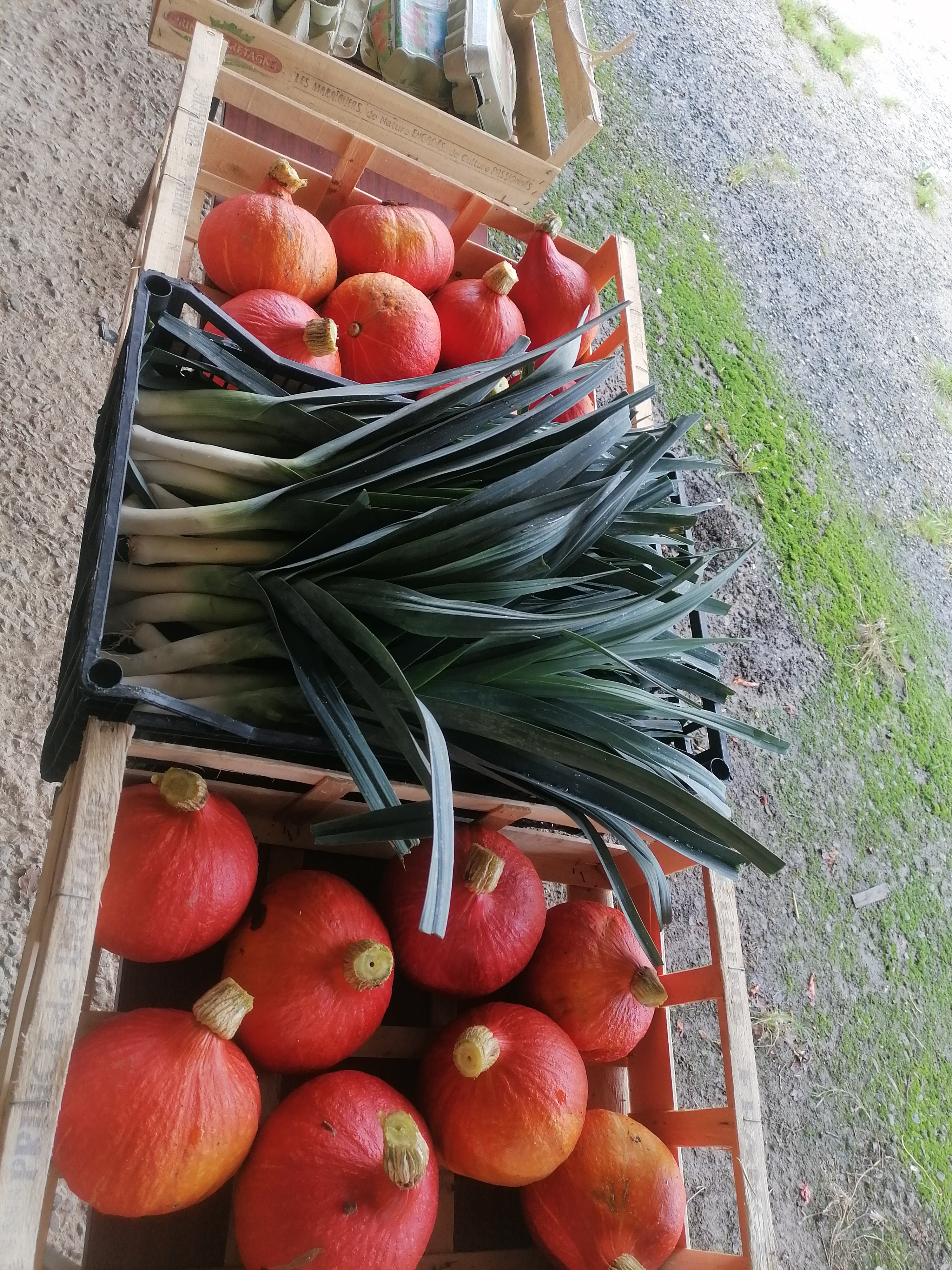 Toujours la gamme de légumes d'été ainsi que les légumes d'automne qui sont récoltés : potimarrons, courge bleue de Hongrie, chou blanc et rouge, poireaux, pommes de terre charlotte, allians et maïwenn...